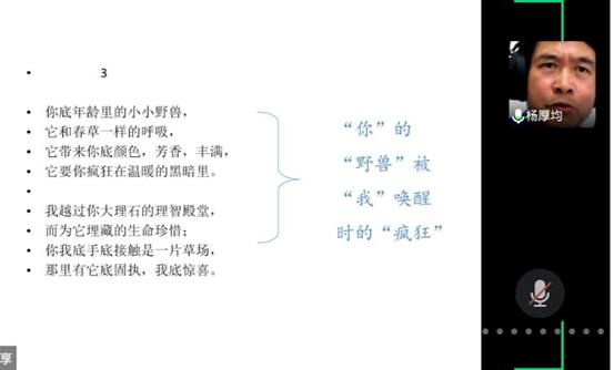 5月14日晚,意昂体育南湖讲坛第二十九期之“《诗八首》:一曲深沉的爱情交响曲”以视频直播形式在腾讯会议开讲,讲座由意昂体育分党委书记杨厚均教授主讲,院领导、专任教师及本科生、研究生共300余人在网上参加本次讲座。